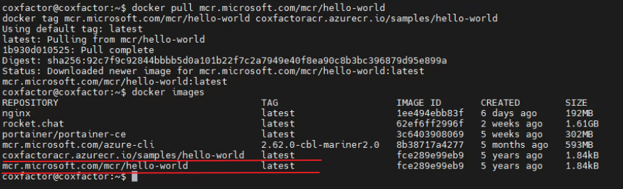 docker tag mcr.microsoft.com/mcr/hello-world coxfactoracr.azurecr.io/samples/hello-world