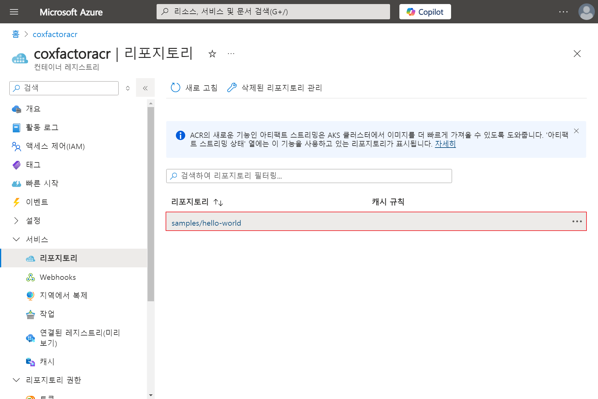 5. Azure Portal > Container Registry > 서비스 > 리포지토리 > Image 확인 가능