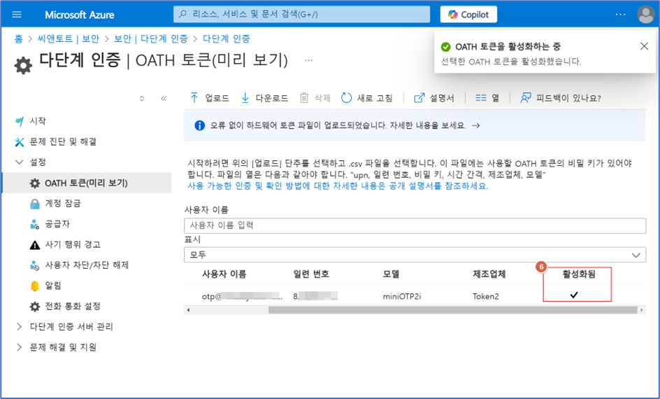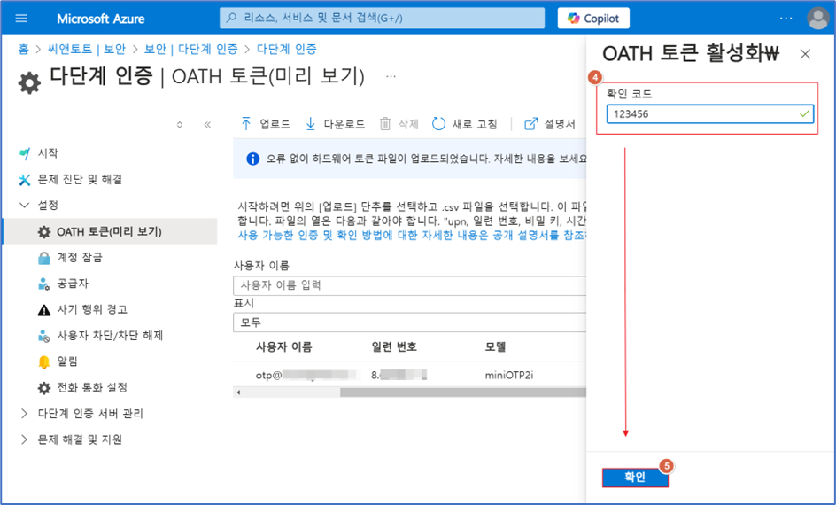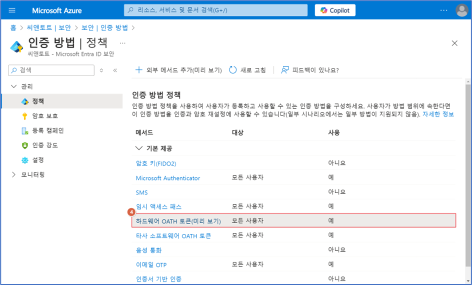 1) Azure Portal > Microsoft Entra ID > 보안 > 다단계 인증 > “OATH 토큰”