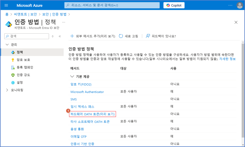 2) 하드웨어 OATH 토큰(미리 보기) 사용하도록 설정을 진행합니다.