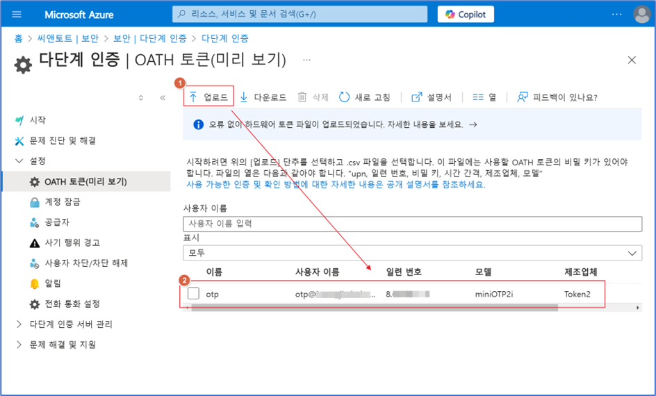 TOKEN2 CSV 파일을 Azure에서 등록합니다.