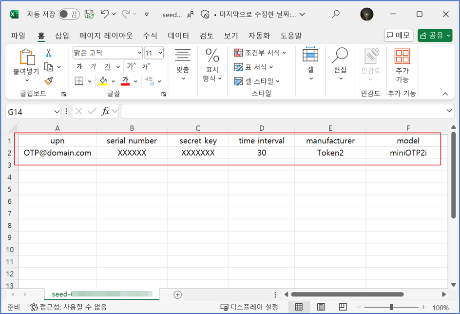 1) “Token2”에서 보낸 CSV 파일은 아래와 같은 구조이며, OTP를 사용할 UPN