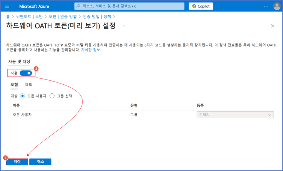 하드웨어 OATH 토큰 사용설정 및 대상자를 선택 후 저장합니다.