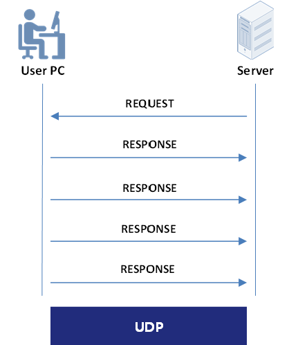 연결 없음: UDP는 데이터를 전송하기 전과 후에 별도의 연결 설정이나 종료 절차가 없습니다. 이는 연결 설정에 필요한 오버헤드(Overhead)를 제거하여 데이터 전송 속도를 향상시킵니다.