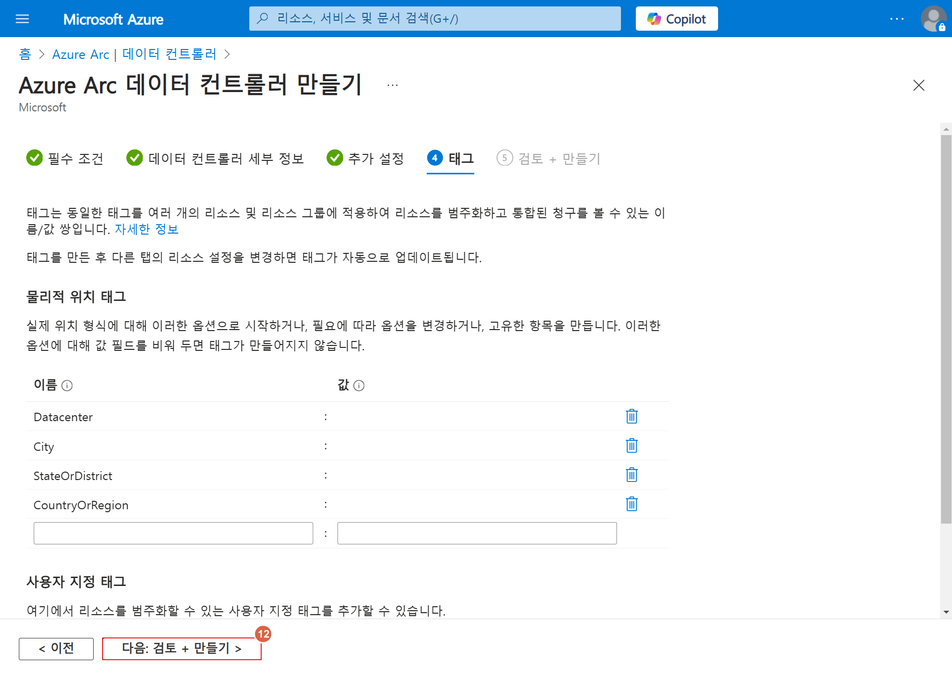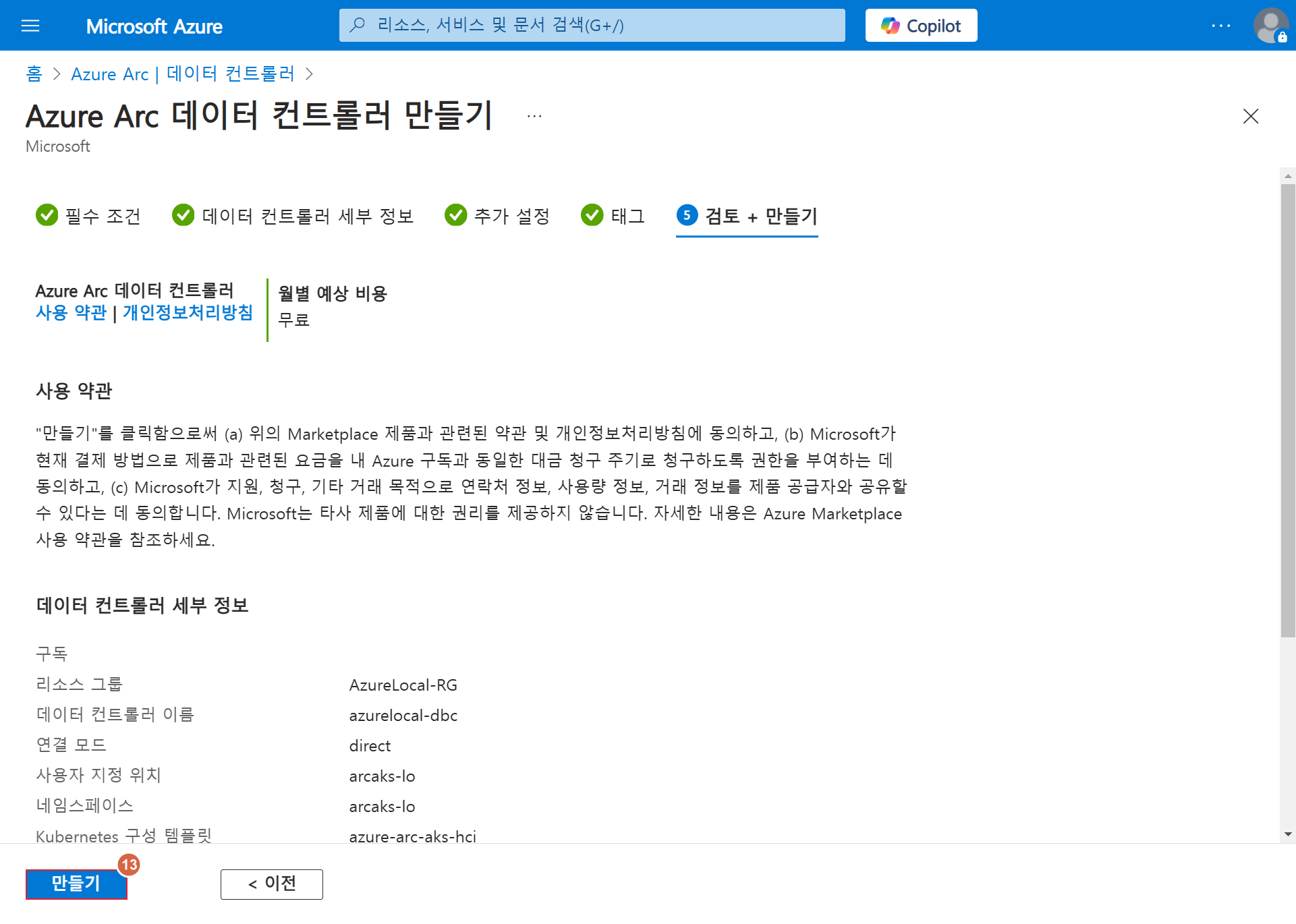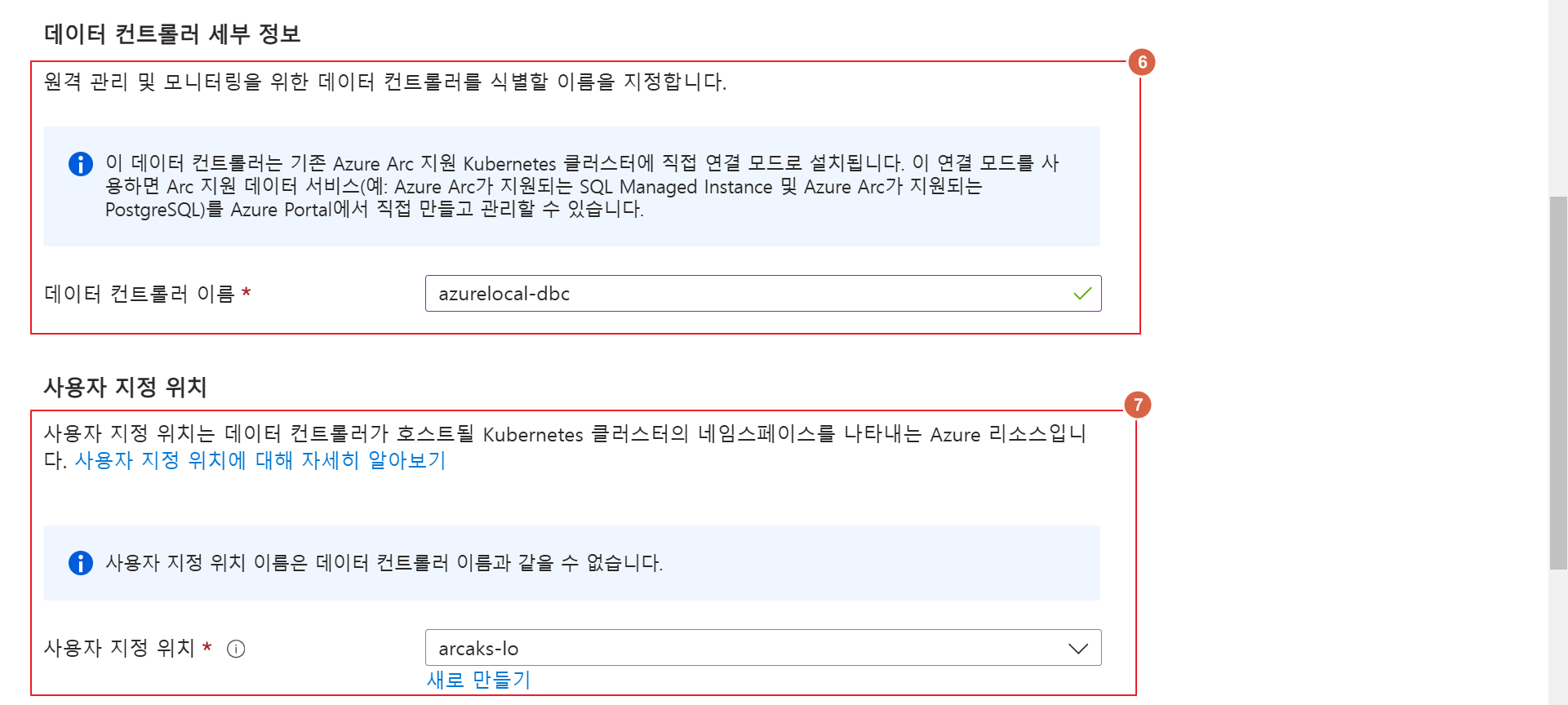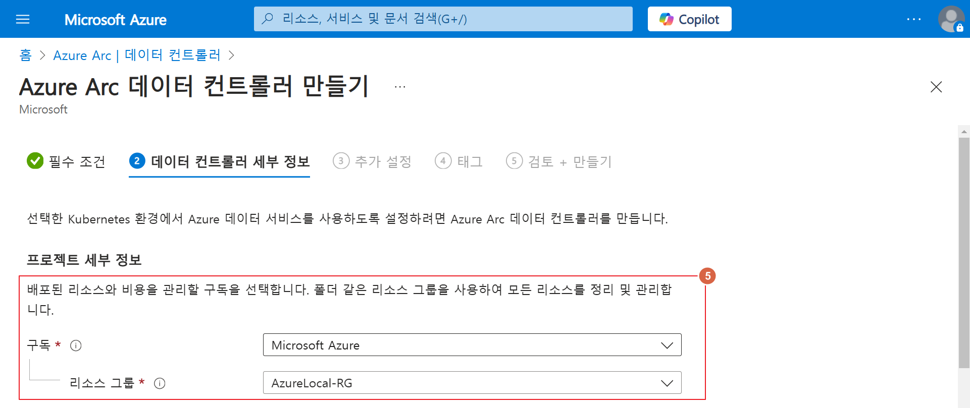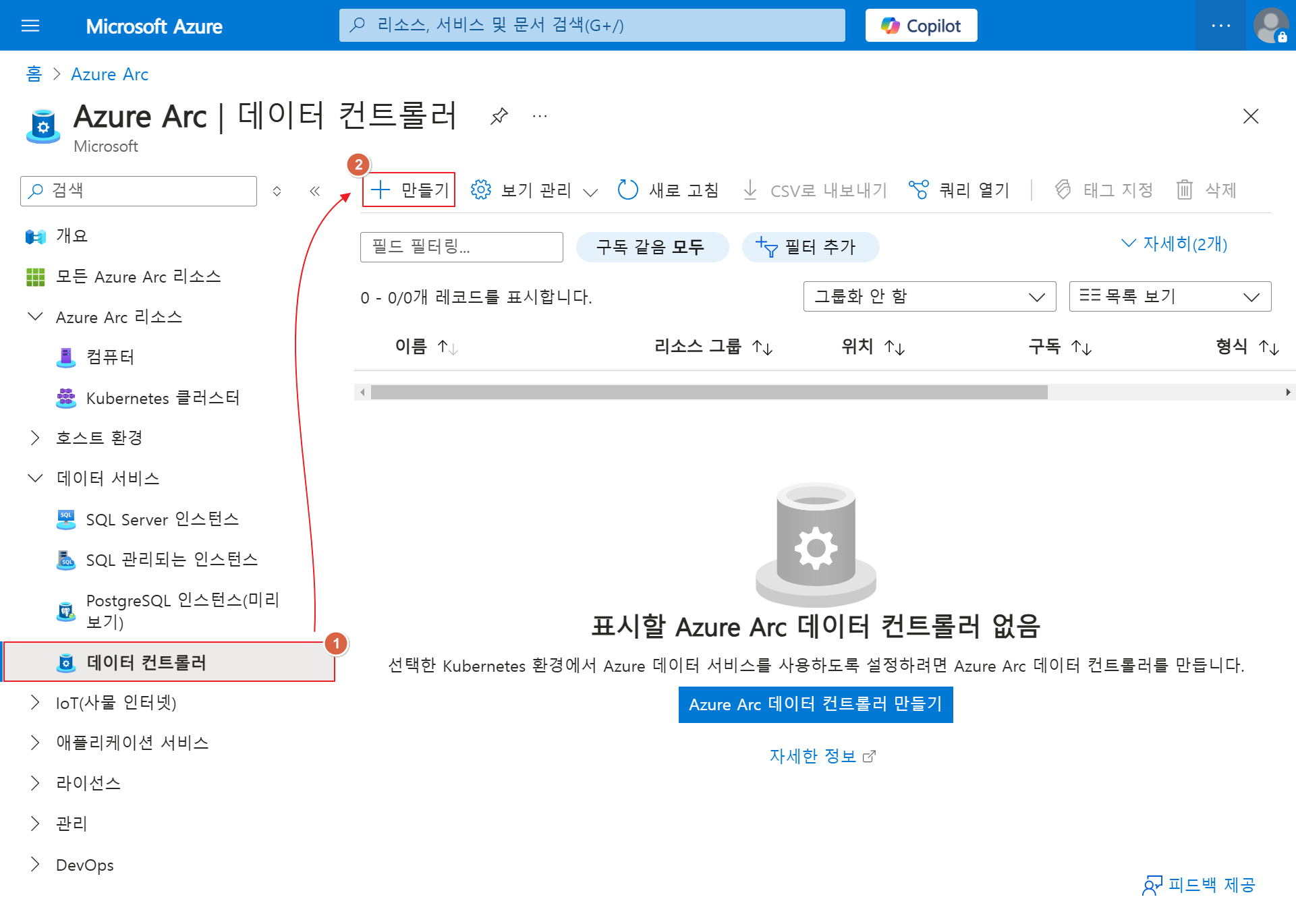1. Azure Portal > Azure Arc > 데이터 서비스 > 데이터 컨트롤러 > "+ 만들기"