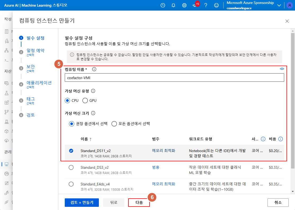 2. 필수 설정 "컴퓨터 이름", "가상 머신 유형", "SKU" 입력 및 선택