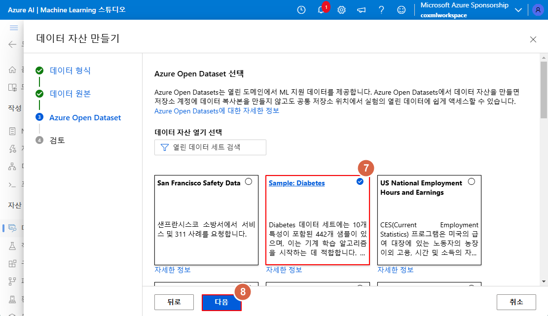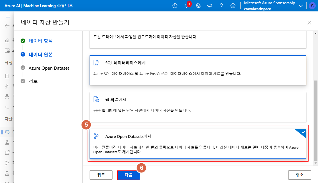 4. Azure Open Dataset 에서 제공되는 목록중 원하는 Open Datasets을 선택하고 Azure ML Datasets 생성을 완료합니다.