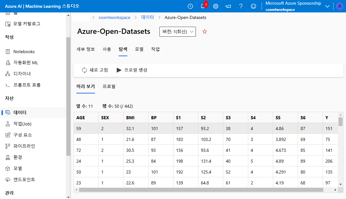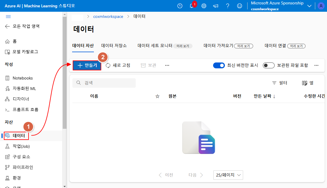 1. Azure ML Studio > 자산 > 데이터 > "+ 만들기"