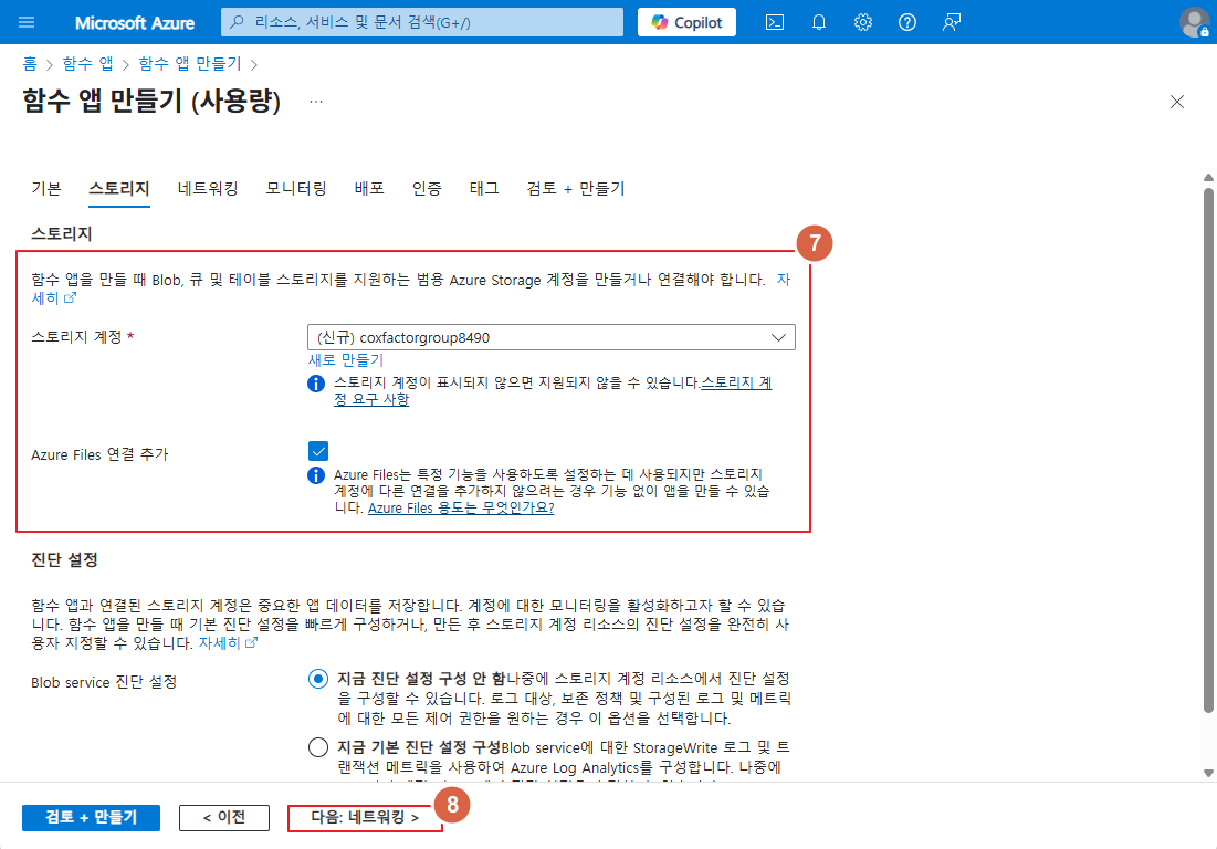 Azure Functions는 실행 시 파일을 저장하기 위해 Storage Account가 필요
