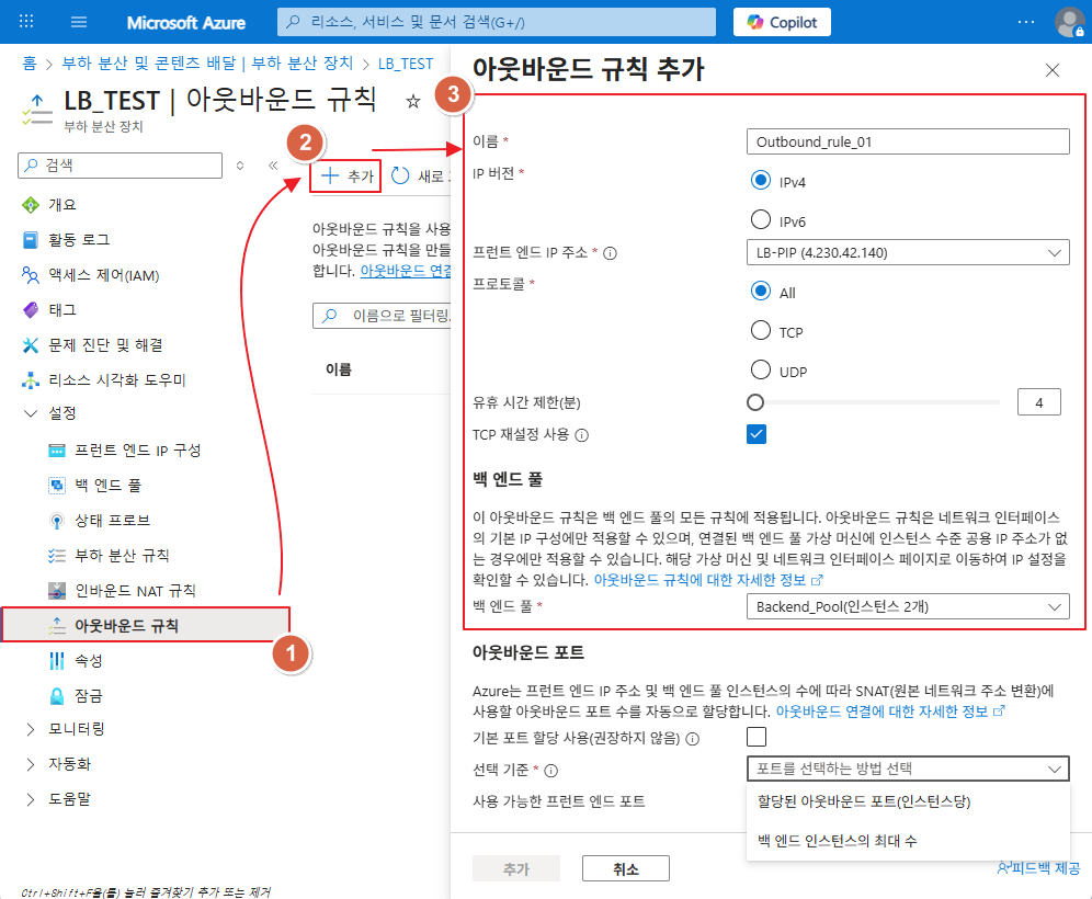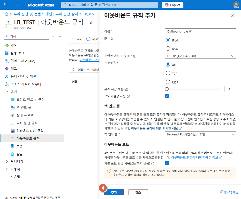 1. Azure Portal > LB > 설정 > Outbound Rule > "+ 추가"