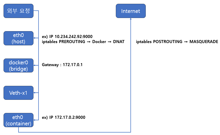 | veth xxx (virtual ethernet) | eth0 (container) ↔ docker0 (host)를 연결하는 가상 이더넷 인터페이스이며, eth0 (container)와 한쌍을 이루며 연결됨 |