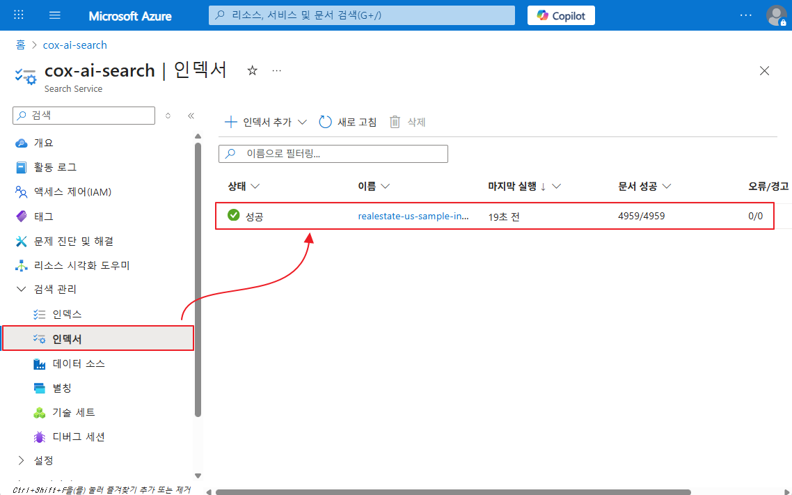 성공(Success) 로 표시되면 인덱싱이 완료된 것입니다.