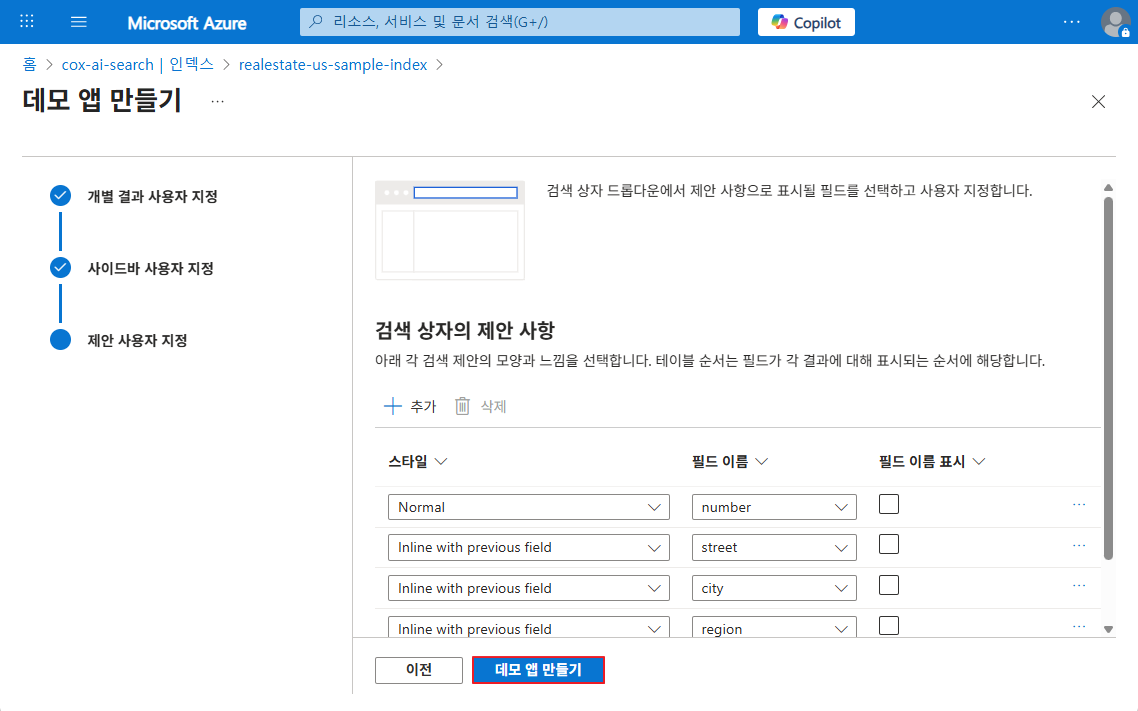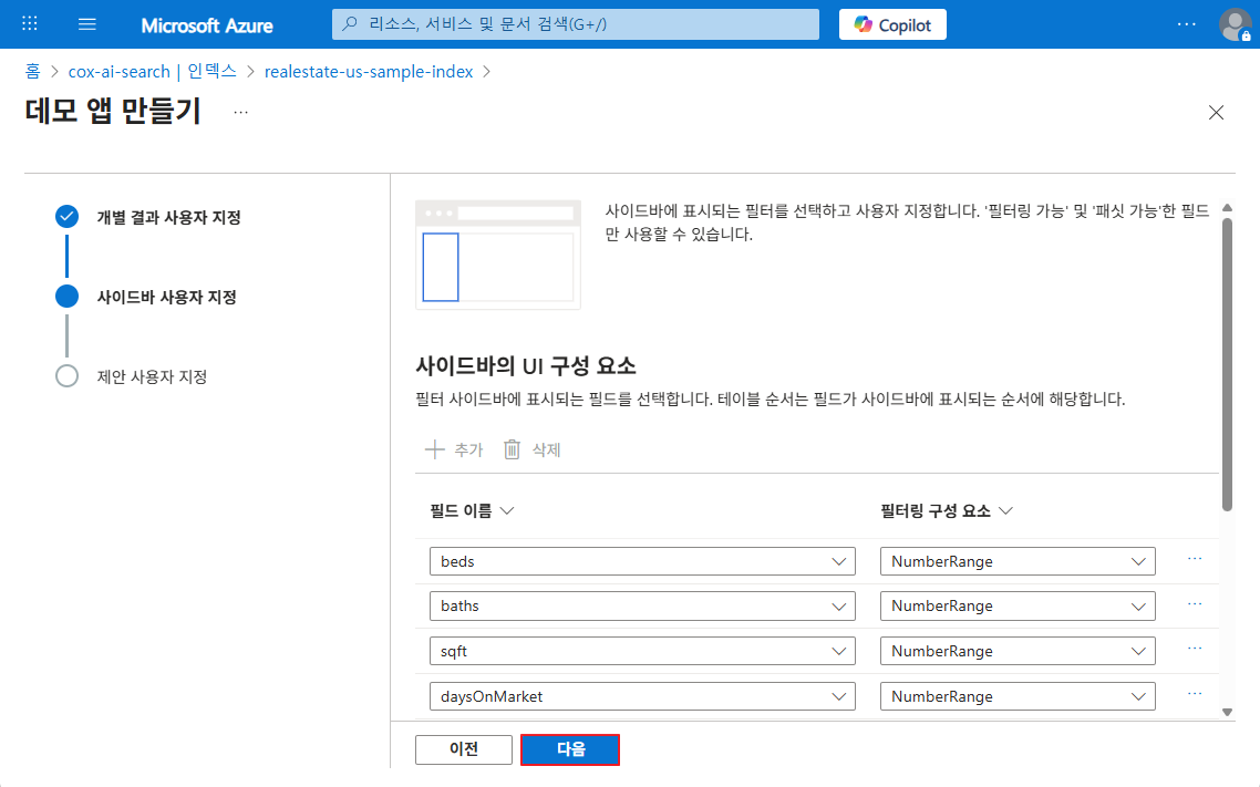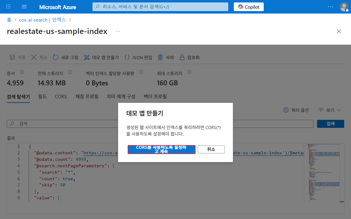 "Azure AI Search"를 배포한 뒤, 기본 제공되는 샘플 데이터 소스를 연결하고, 이를 기반으로 데모 앱을 실행