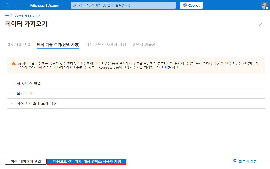 이 단계는 Cognitive Search 기능을 활용하여 AI 기반 데이터 인식 기술을 적용할 수 있습니다.