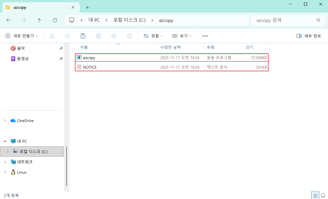 2. ZIP 다운로드 후 압축해제 "azcopy", "NOTICE" 파일 복사 > C:\azcopy 폴더 생성 후 복사 붙여넣기