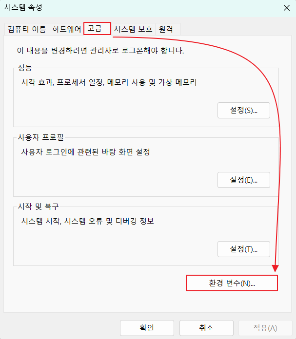 3. PATH 환경 변수 추가 > Windows Key + R "sysdm.cpl" 입력 > 시스템 속성 창 > 고급 > "환경 변수(N)..." 클릭