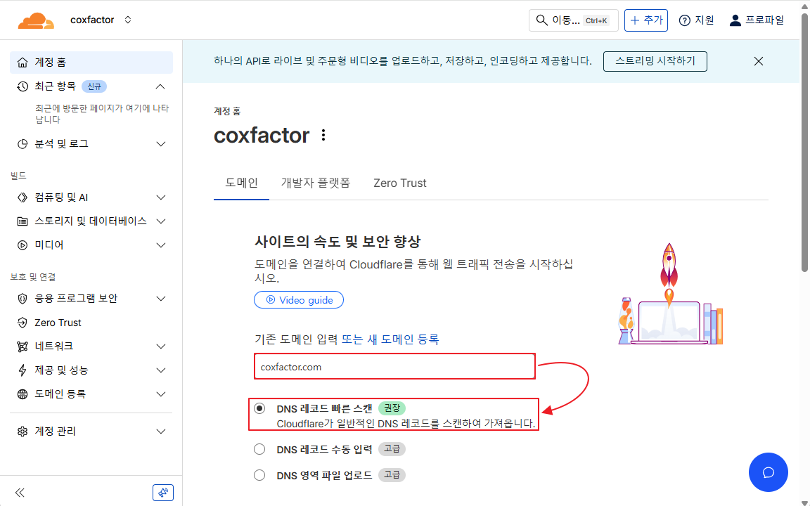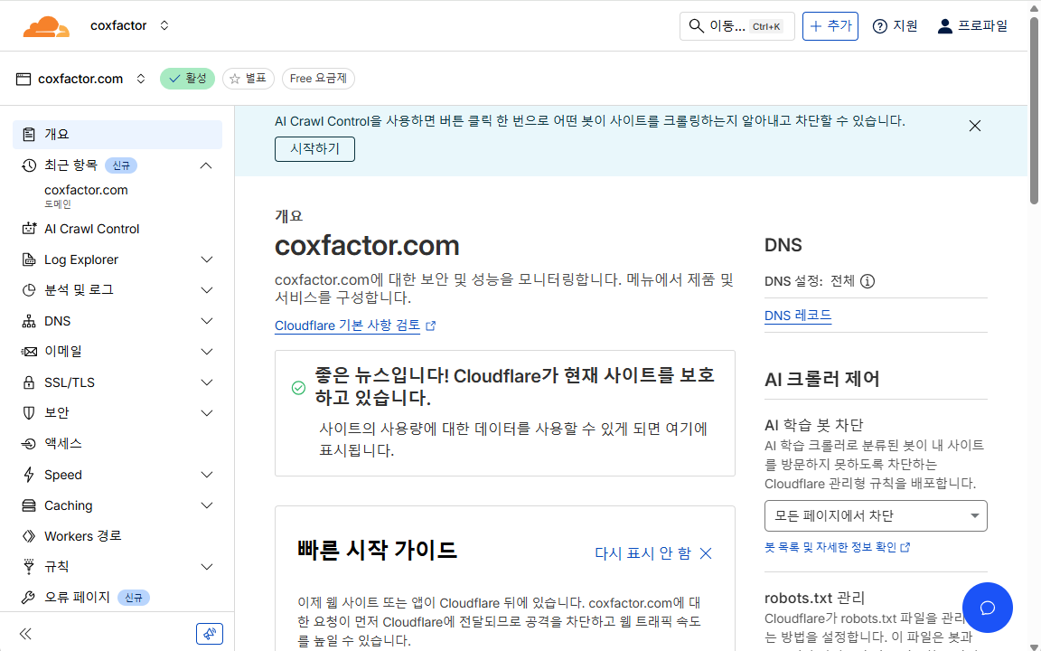 https://www.cloudflare.com/ko-kr/ 에 접속해 계정을 생성하고 로그인합니다.