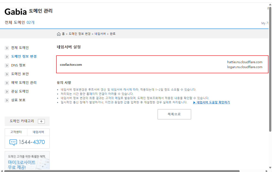 가비아에서 변경할 Domain 선택 후 > 네임서버 설정 > Cloudflare에서 제공하는 네임서버로 변경 및 저장