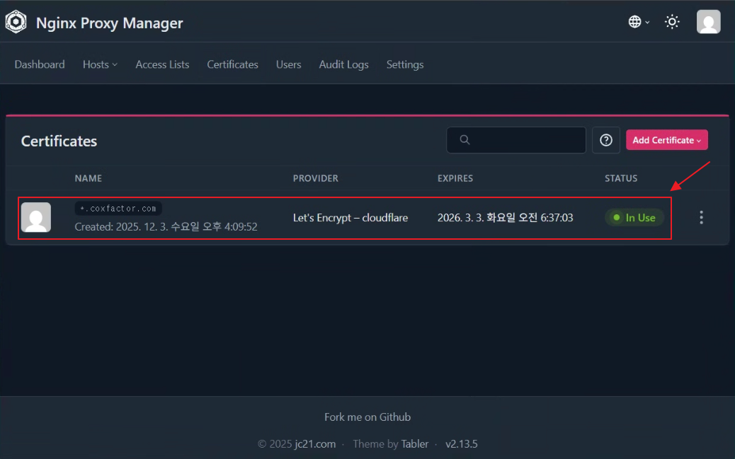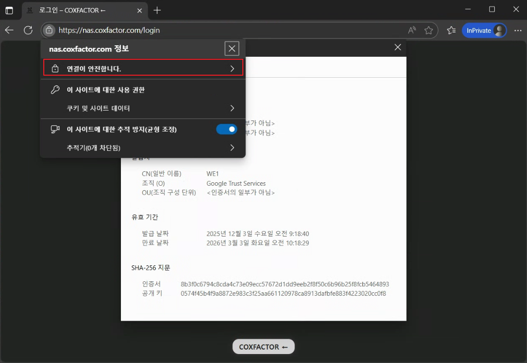 발급받은 인증서 선택 (예: *.coxfactor.com)