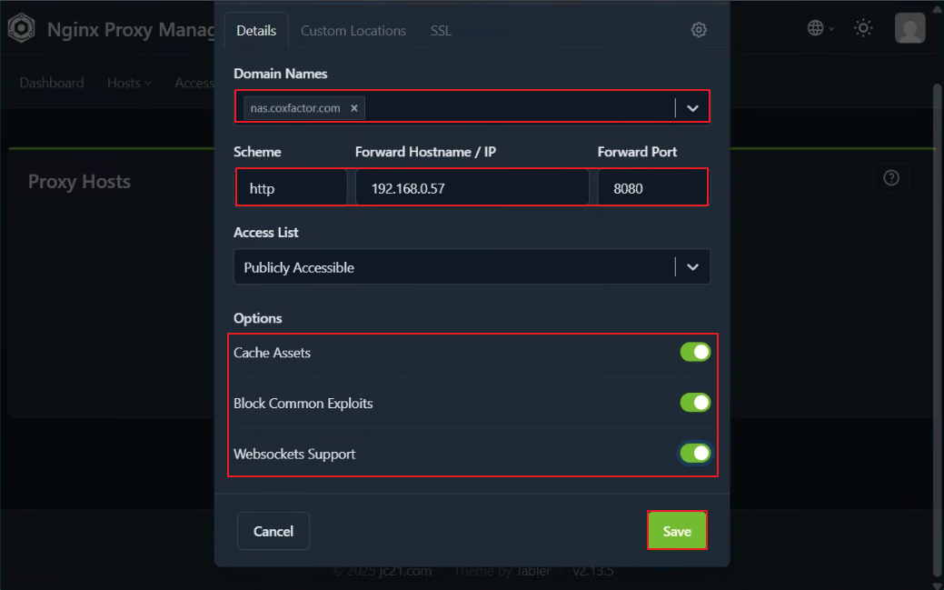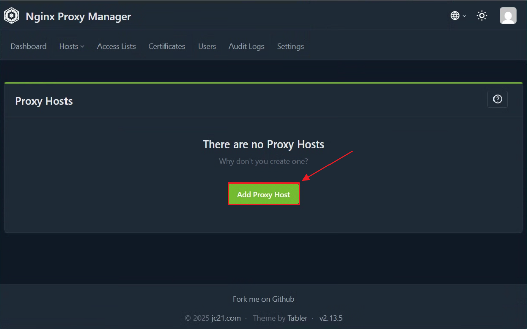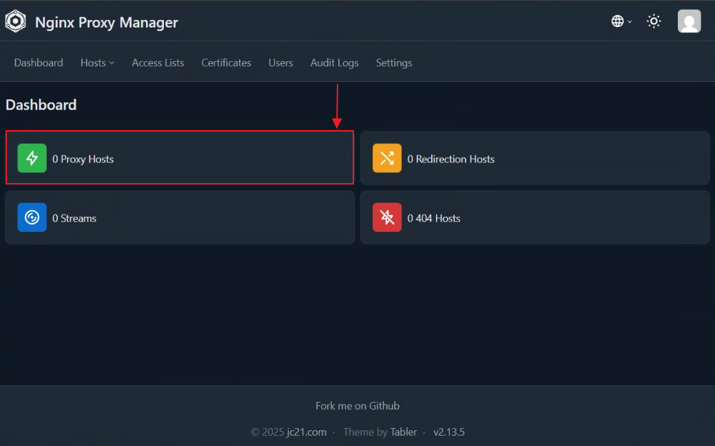 Dashboard > Proxy Hosts 선택 > Add Proxy Host