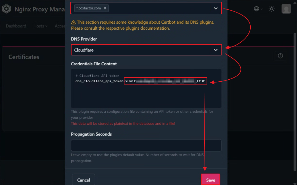 Cloudflare API Token 입력 : dns_cloudflare_api_token = <Cloudflare API Token>