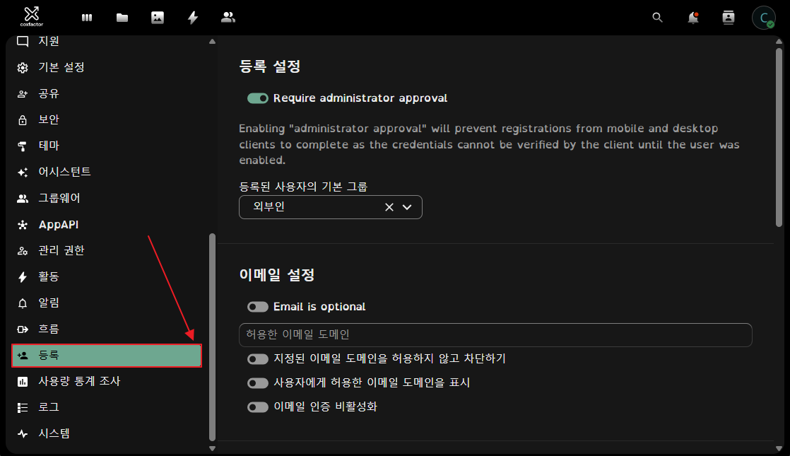 기본적으로 Nextcloud는 관리자가 신규 계정을 직접 생성해야 하지만, Registration 앱을 활성화하면 사용자가 스스로 가입할 수 있는 환경을 제공합니다. 또한, 필요에 따라 관리자 승인 절차를 추가하여 보안을 강화할 수도 있습니다.