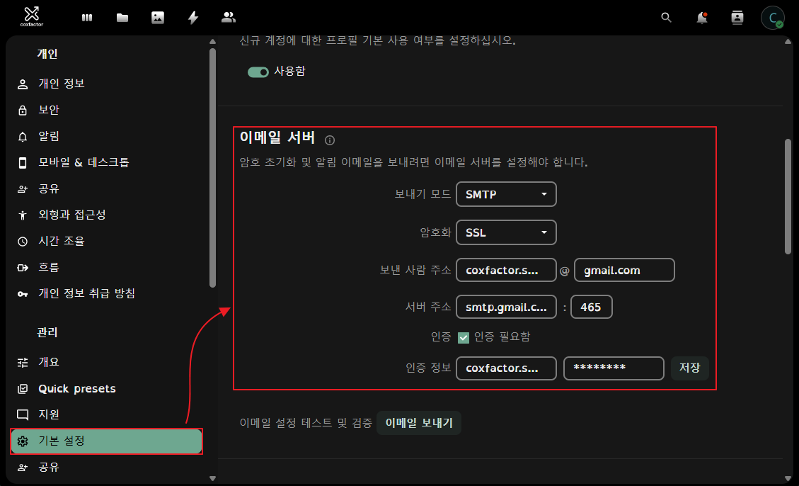 - 기본 설정 → 이메일 서버 SMTP 작성