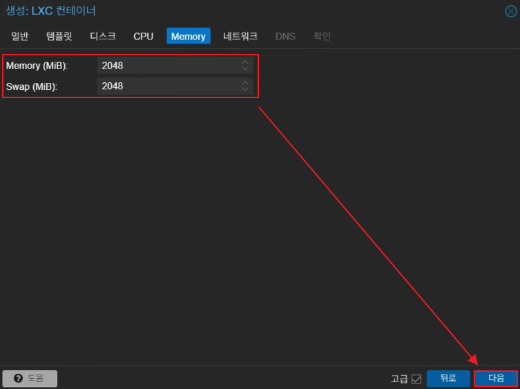 Swap: Memory와 동일하거나 약간 낮게 설정 (예: Memory 2048MiB → Swap 2048MiB)
