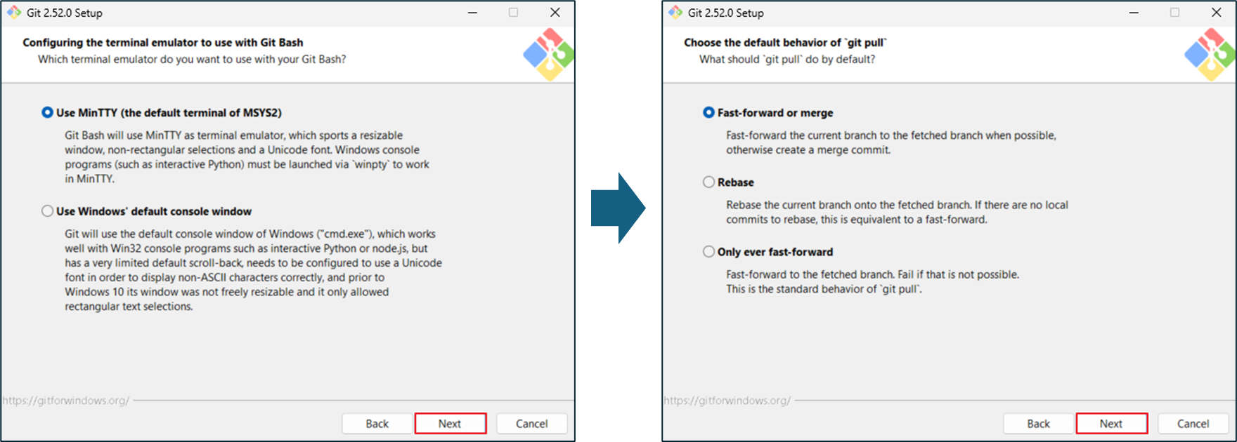7. 터미널은 MinTTY선택, git pull 기본 동작은 Fast‑forward or merge 선택 후 "Next"