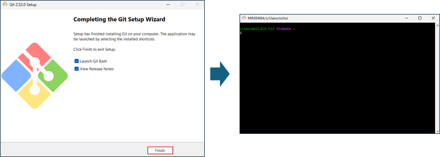 9. Launch Git Bash 체크한 상태로 Finish(피니시)를 누르면 Git Bash(깃 배시) 터미널이 즉시 실행됩니다.
