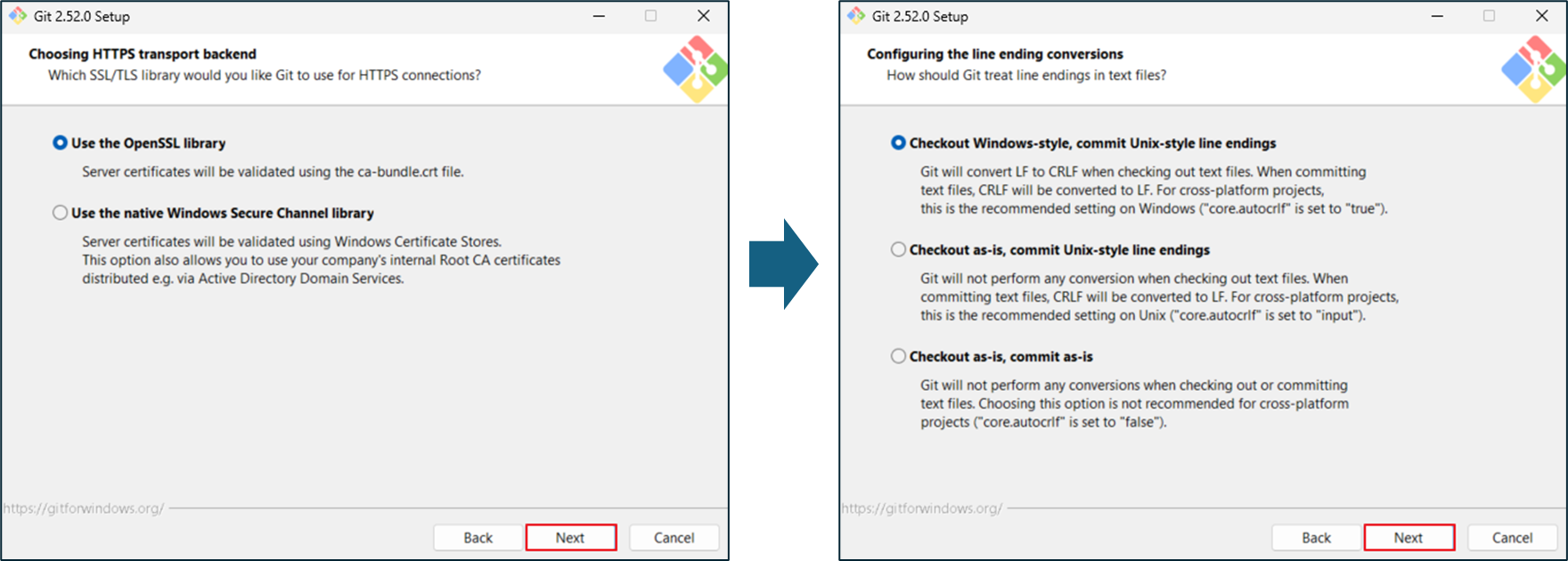 6.HTTPS는 OpenSSL 사용, 줄바꿈은 ‘(Checkout Windows‑style, commit Unix‑style)’ 선택 후 "Next"