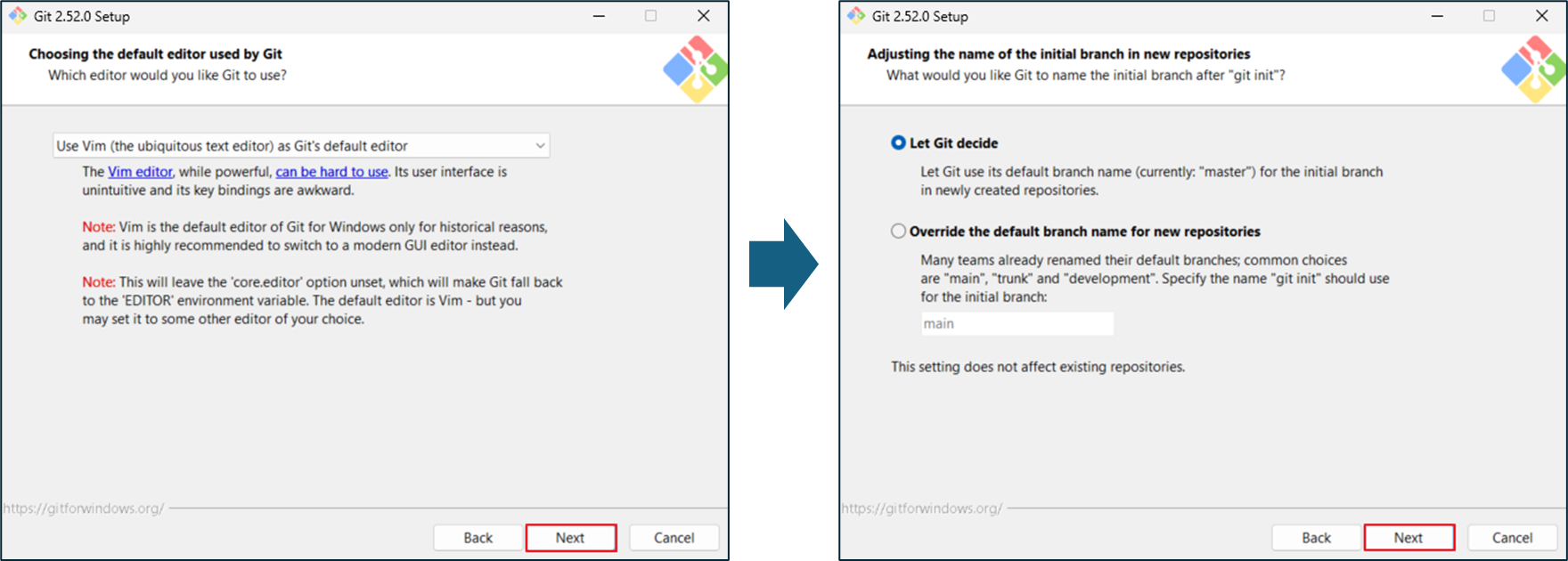 4. 기본 편집기와 초기 브랜치 이름을 변경할 필요 없으면 그대로 두고 "Next"를 눌러 계속 진행합니다.