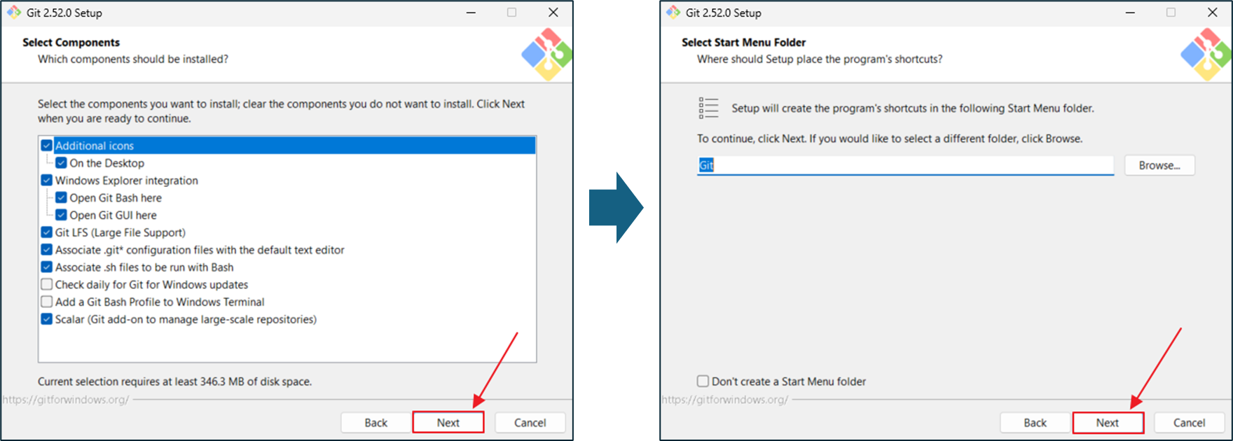 3. 기본 컴포넌트는 그대로 두고 "Next"를 눌러 시작 메뉴 폴더 생성 단계도 그대로 진행합니다.