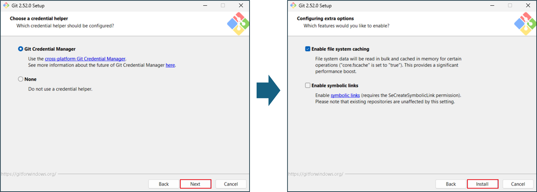8. Git Credential Manager 선택 → 파일 시스템 캐싱만 체크 → "Install"
