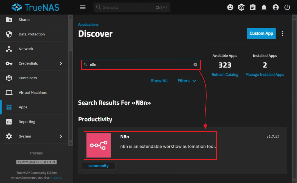 2. Apps 메뉴에서 n8n 검색 "Discover Apps" → n8n Install