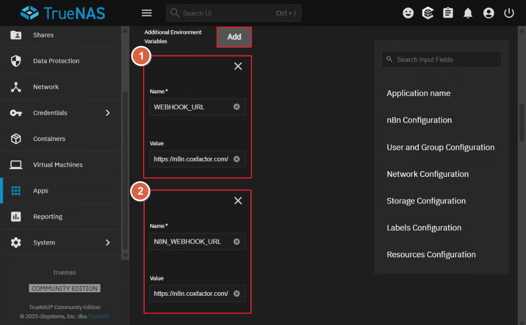 1. TrueNAS → Apps (n8n) → "Edit"