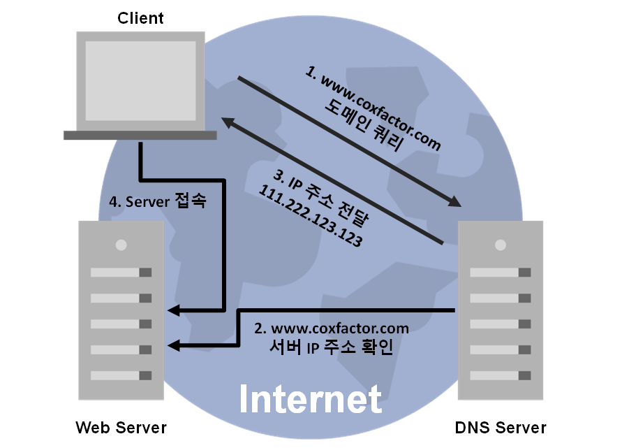 예를 들어, "http://www.coxfactor.com"이라는 도메인 이름을 입력하면, DNS는 이를 해당 서버의 IP 주소(예: 111.222.123.123)로 변환해줍니다.