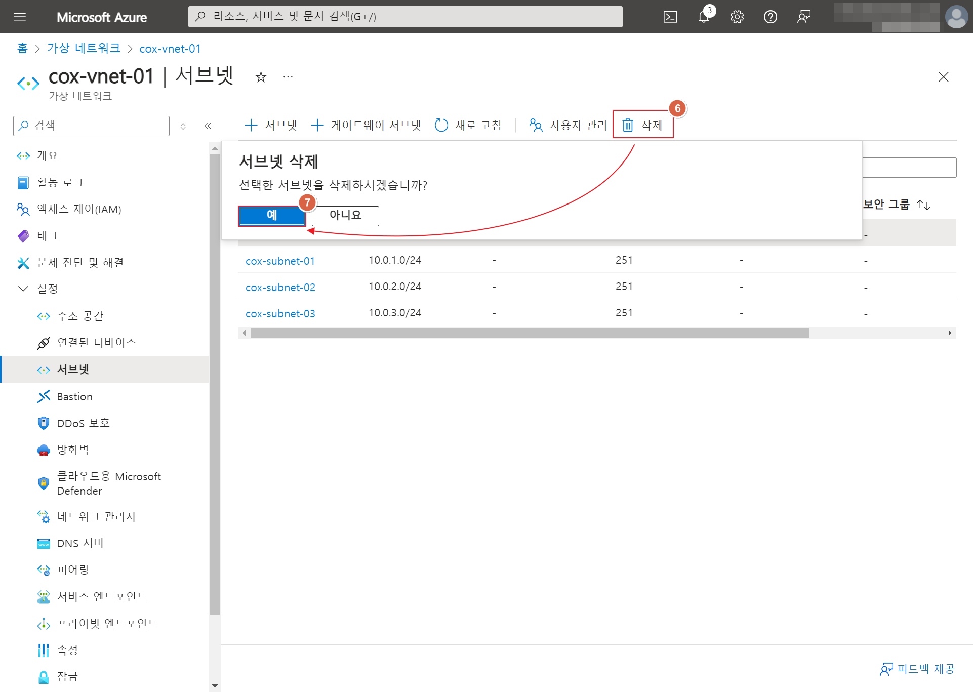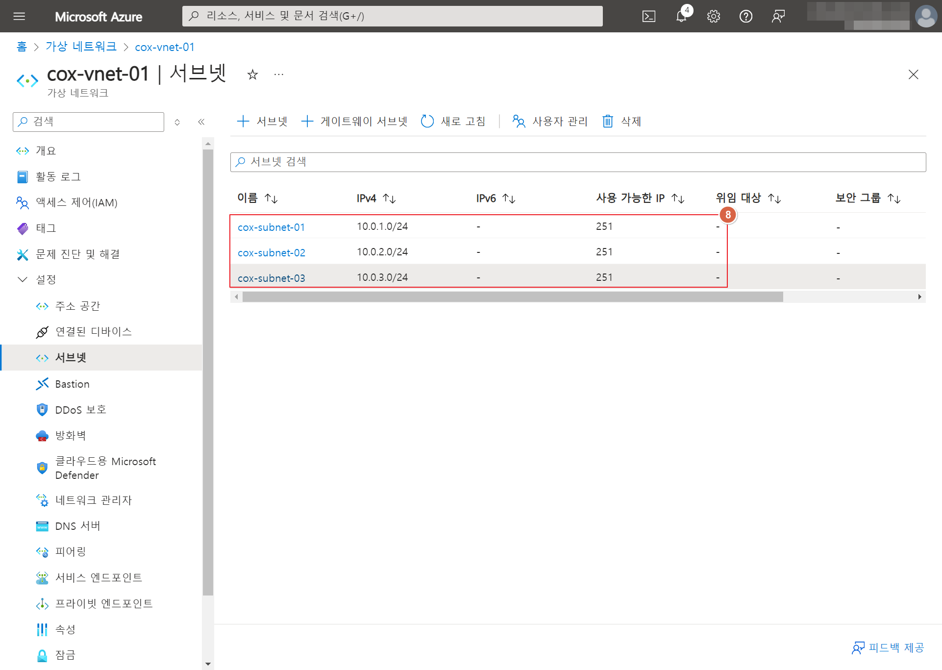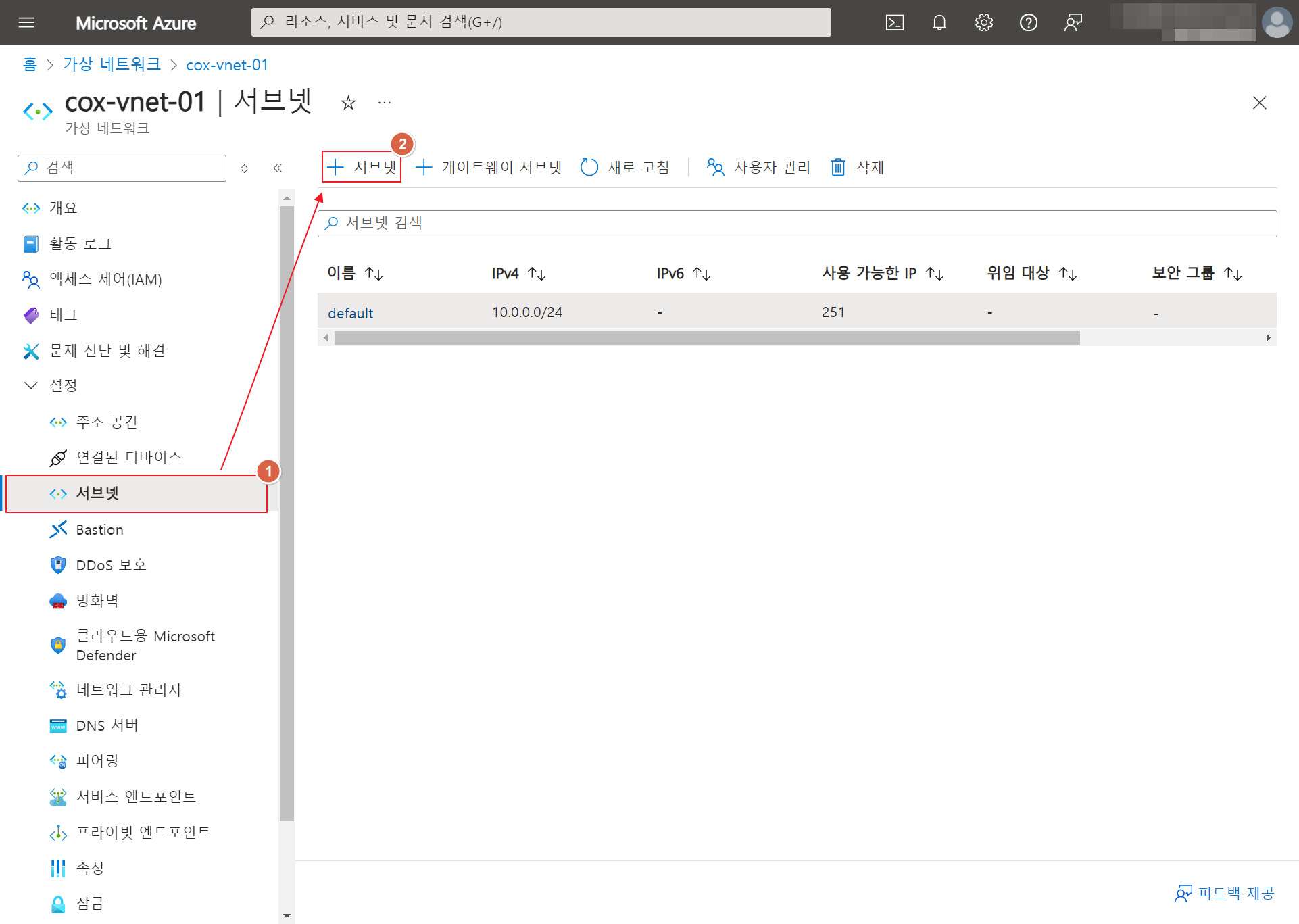지난번 VNET 생성 이후, 이번에는 생성된 VNET에서 Subnet을 추가 및 삭제하고, VNET에서 DNS 주소를 설정하는 방법을 살펴보겠습니다.