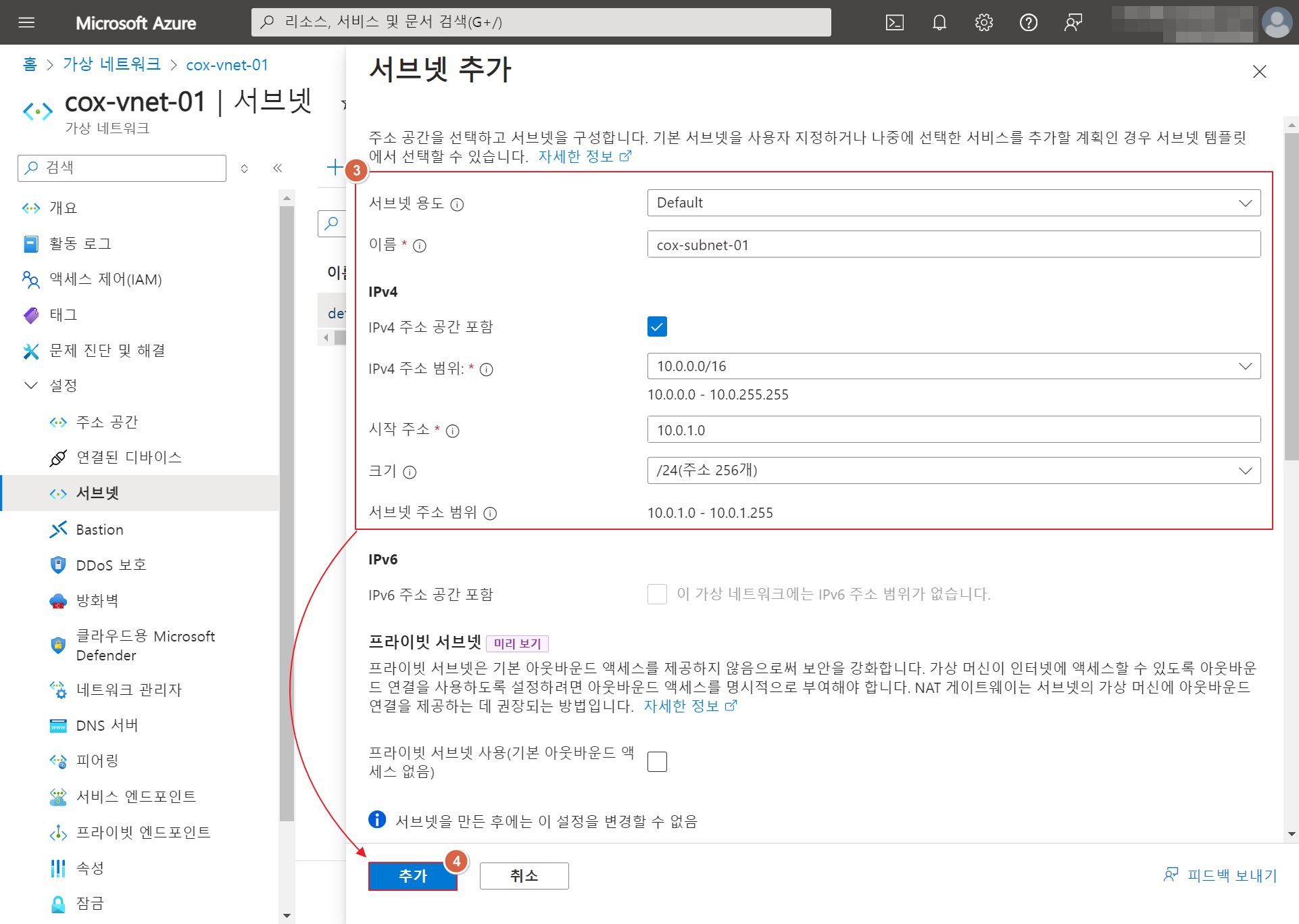 사용 가능한 주소 범위: 10.0.1.4 - 10.0.1.254