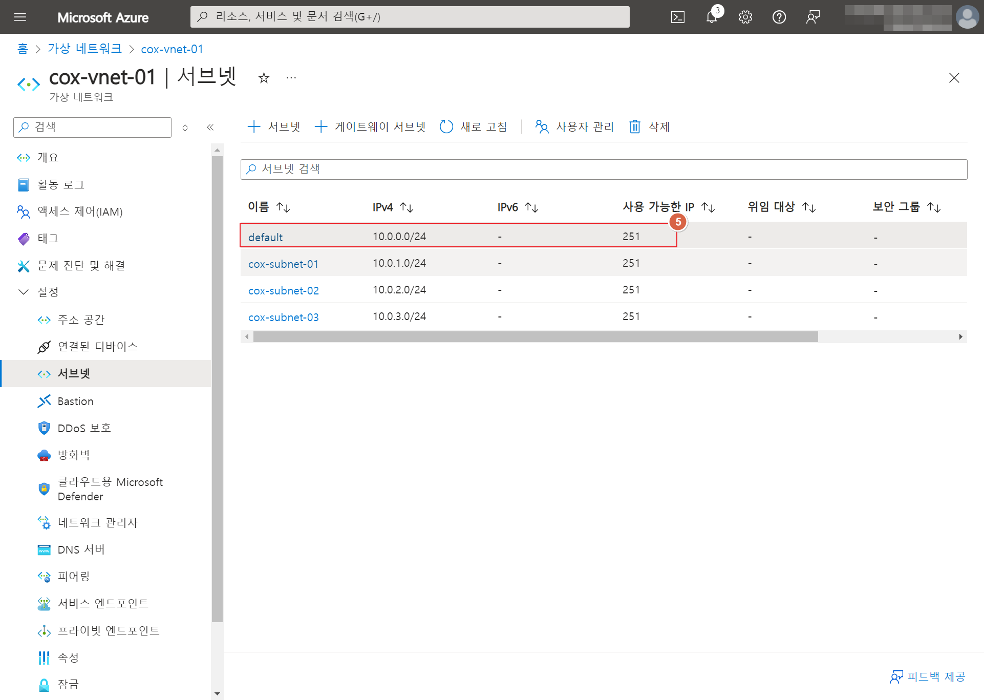 Azure에서는 각 서브넷 내에서 처음 4개의 주소와 마지막 주소를 합쳐 총 5개의 IP 주소를 예약합니다.