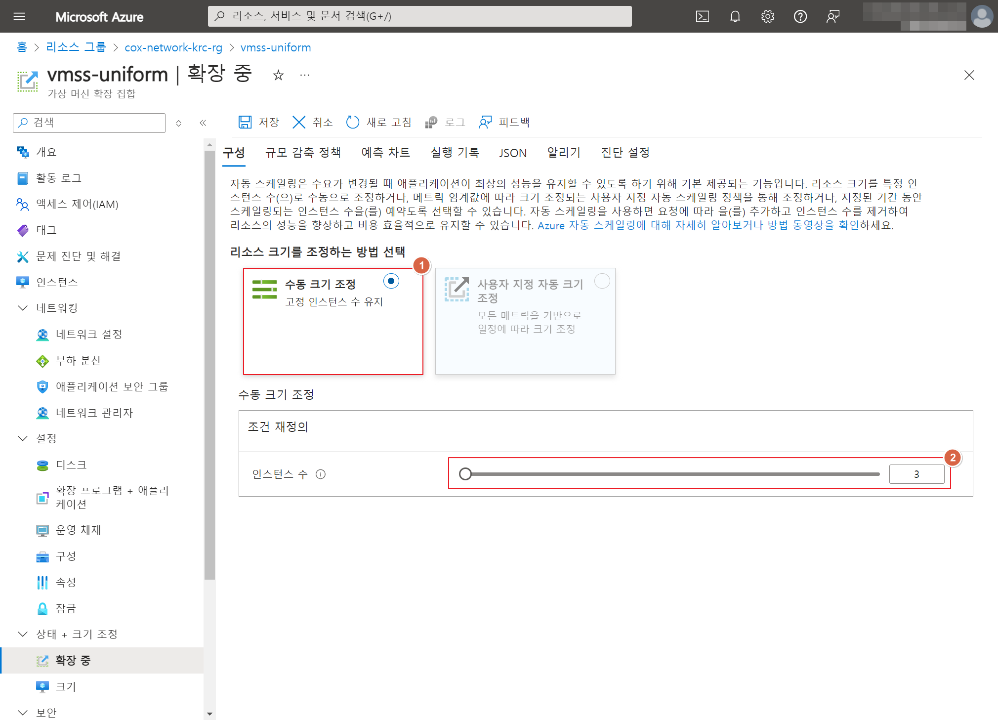 수동 크기 조정은 사용자가 직접 필요한 가상 머신(VM)의 수를 조정하는 방법입니다. 즉, 트래픽이나 워크로드에 따라 자동으로 VM을 늘리거나 줄이는 것이 아니라, 관리자가 상황에 맞게 수동으로 VM 인스턴스를 추가하거나 제거하는 방식입니다.