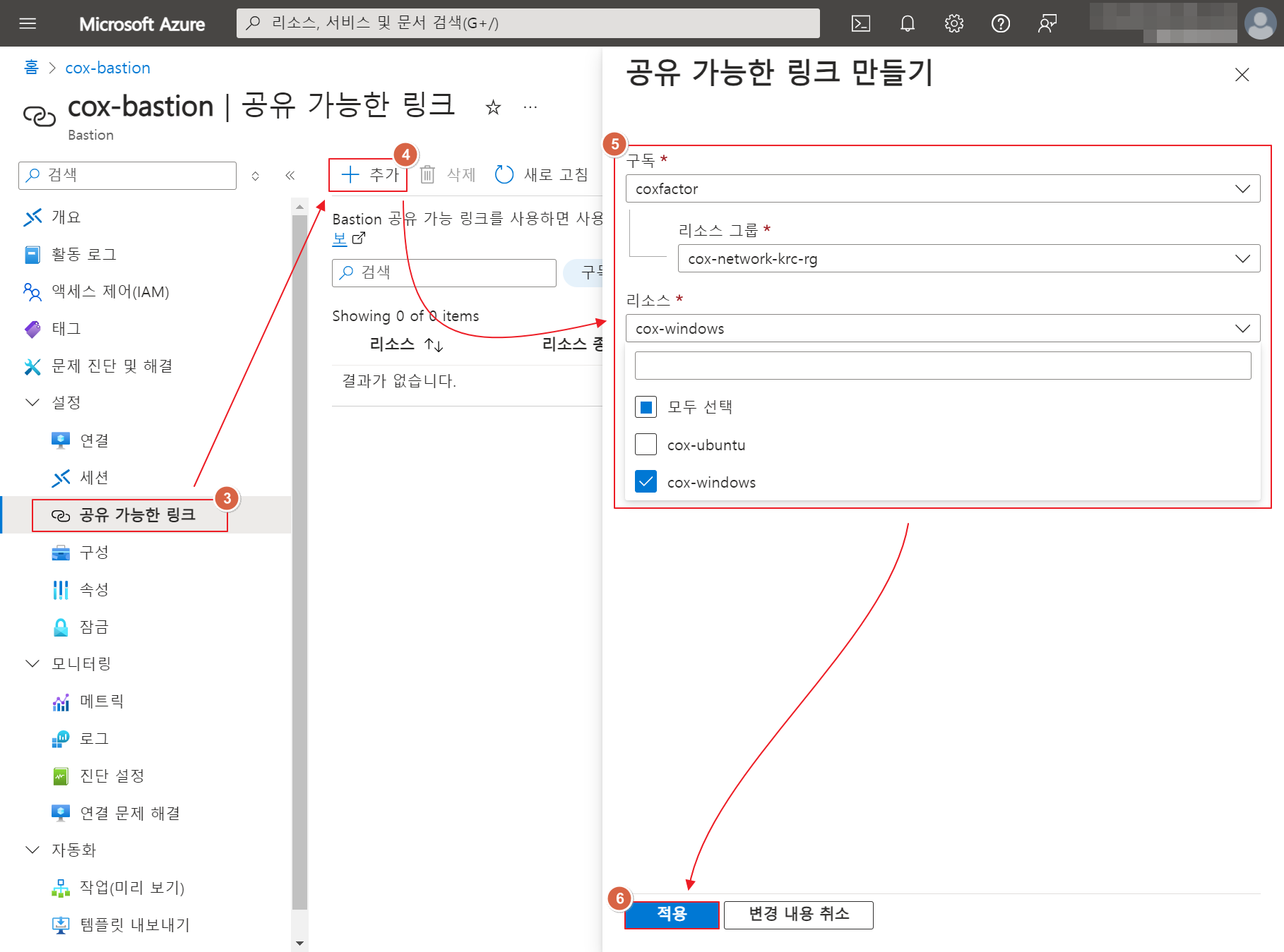 * 공유 링크를 생성할 VM이 있는 "구독", "리소스 그룹", "리소스(VM)" 등을 선택합니다.