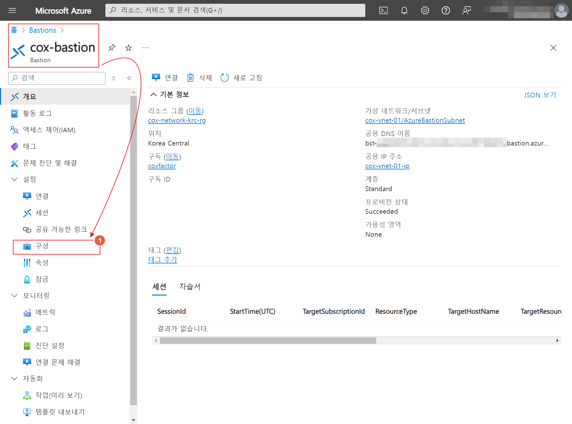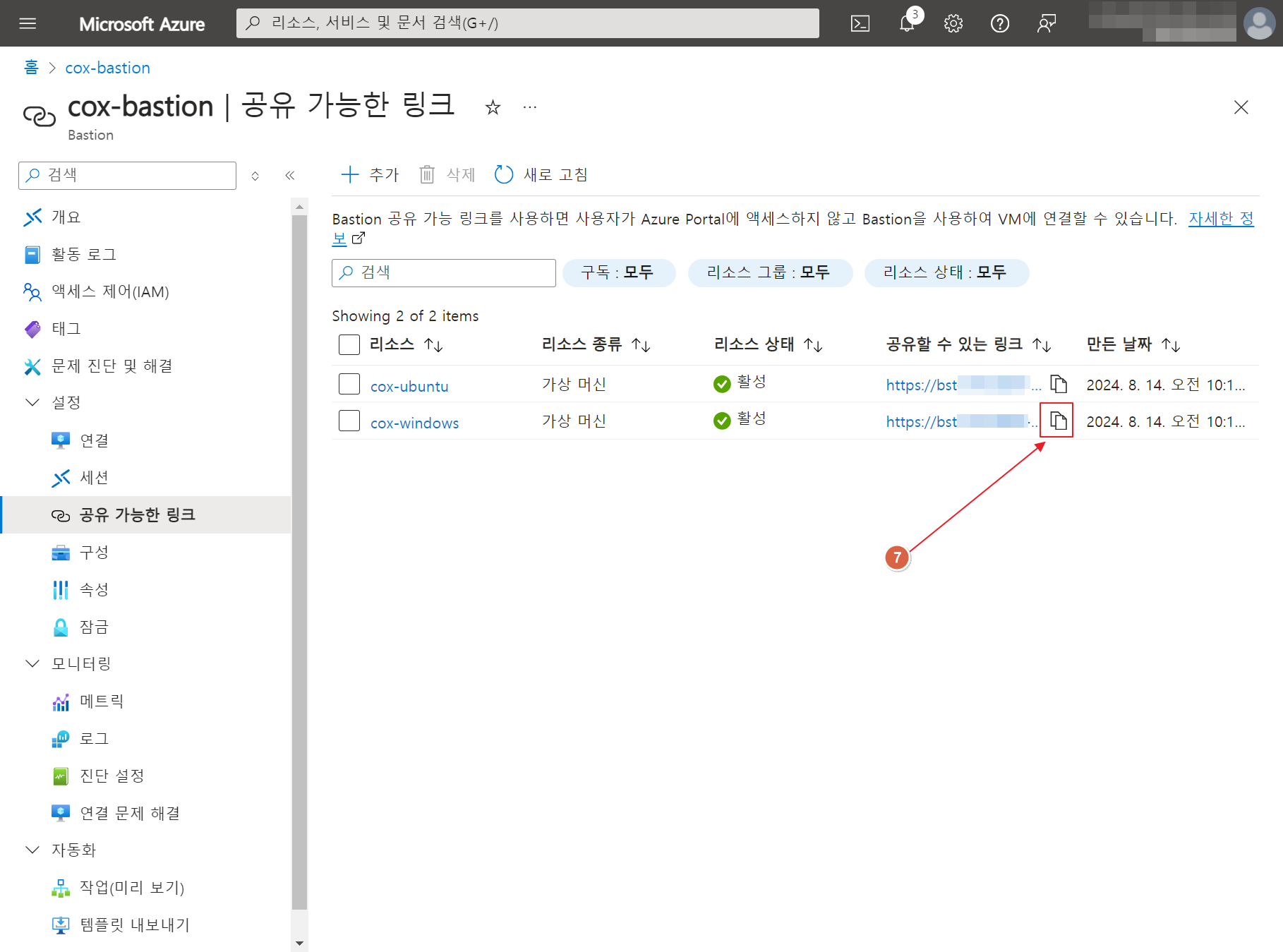 1. Azure Bastion 구성에서 "표준 SKU" 및 "공유할 수 있는 링크" 설정 및 확인