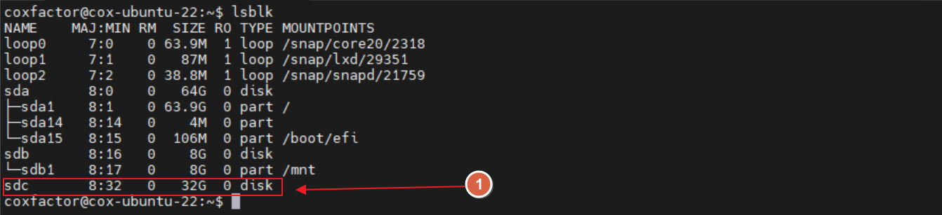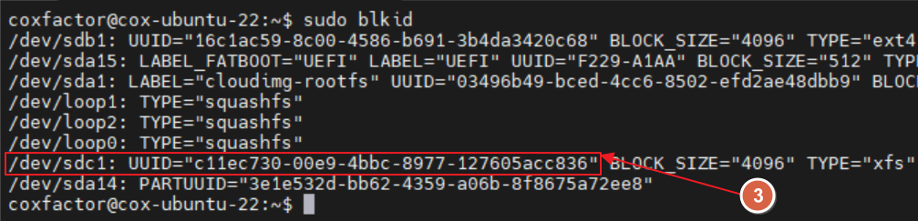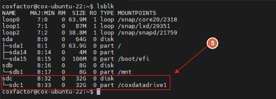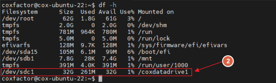 sudo mount /dev/sdc1 /coxdatadrive1