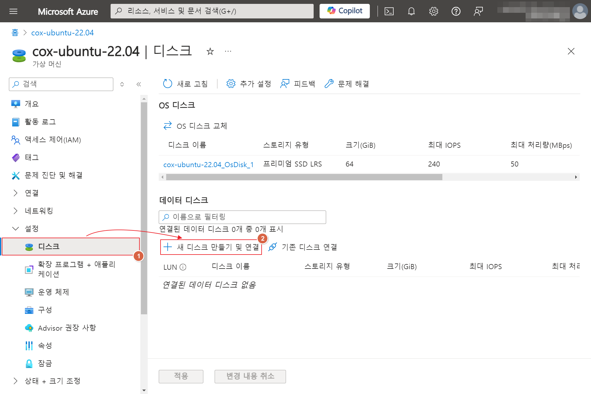 1. Azure Portal에 접속하여 DATA Disk를 추가할 VM에 접속한 후 설정 > 디스크 > "+ 새 디스크 만들기 및 연결"을 클릭합니다.