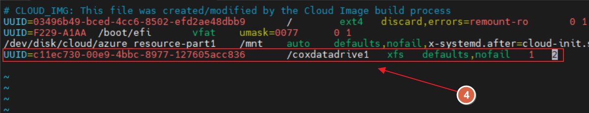 UUID=디스크의_UUID /coxdatadrive1 xfs defaults,nofail 1 2