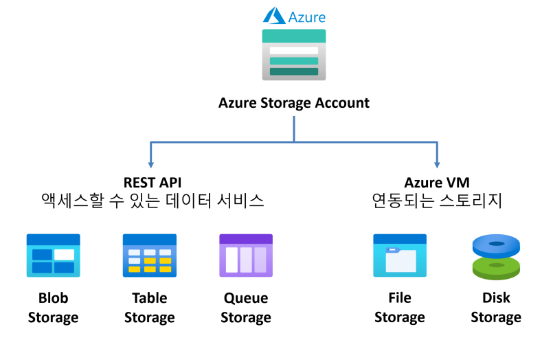 "Azure Storage Account"는 클라우드 저장소 서비스로, 다양한 데이터 유형을 안전하고 유연하게 확장하여 저장할 수 있는 SaaS(Software-as-a-Service)입니다. 이 서비스는 Files, Blob, Table, Queue, Disk 등 여러 스토리지 유형을 포함하며, 각 유형은 특정 데이터 구조에 최적화되어 있습니다.