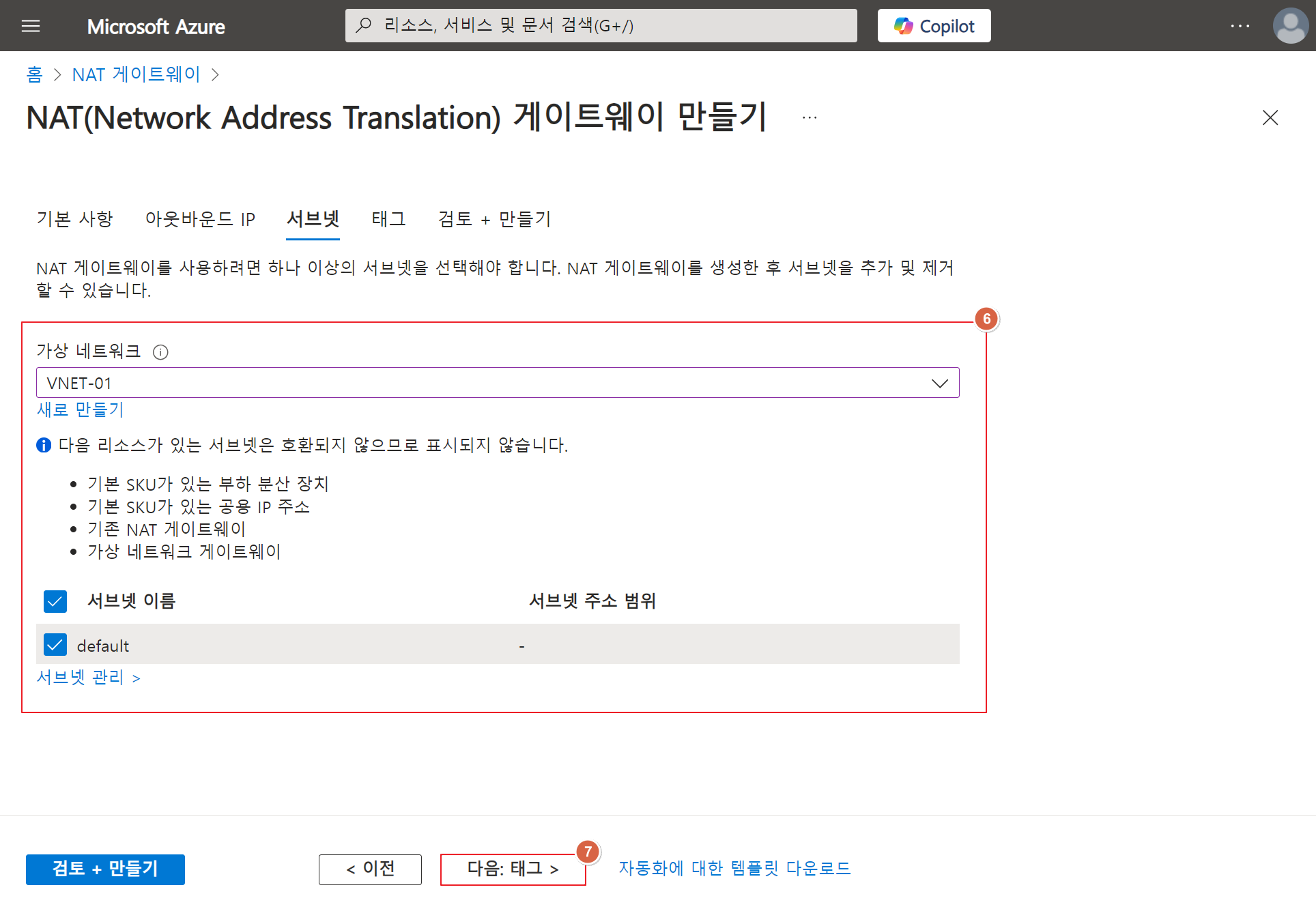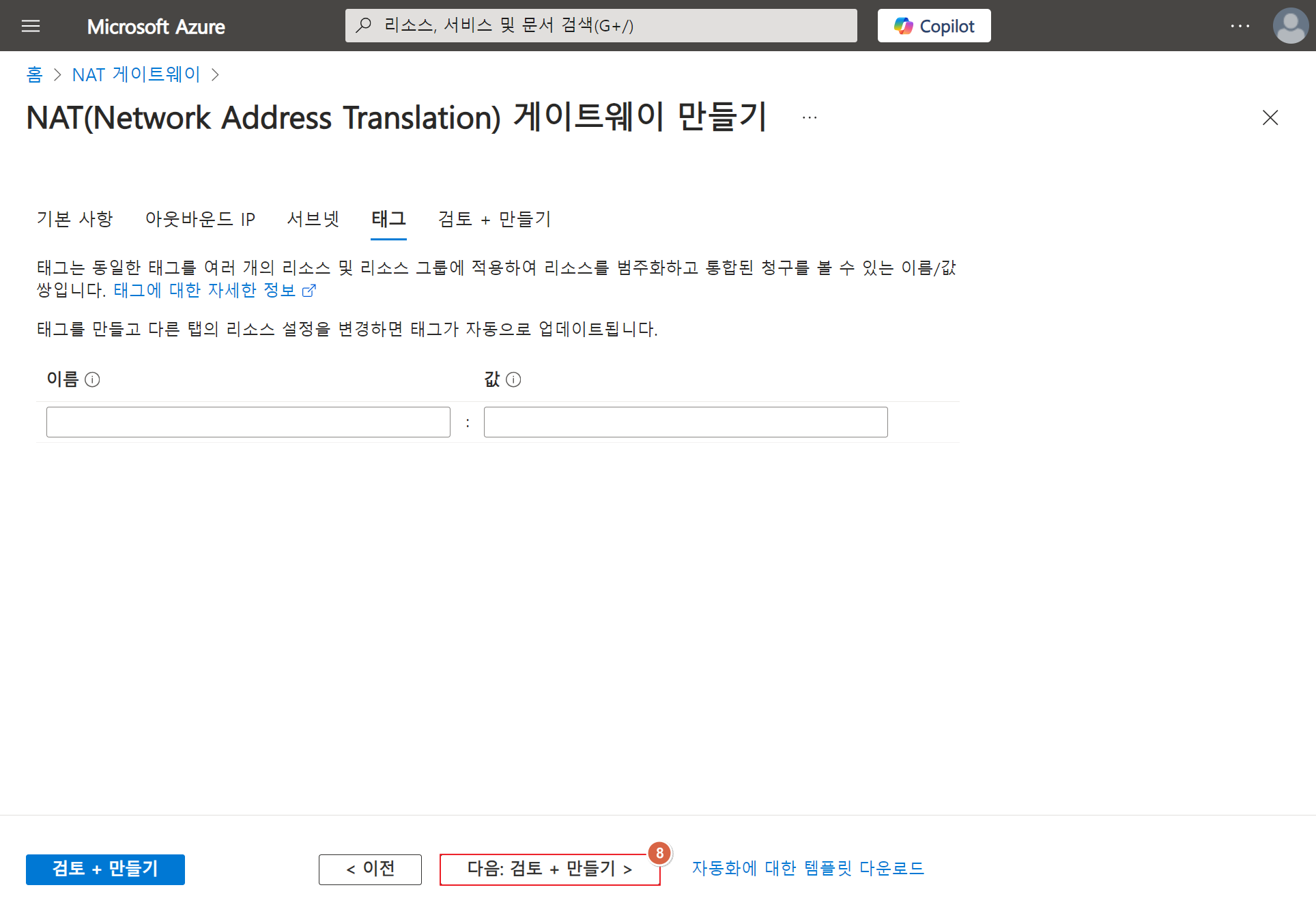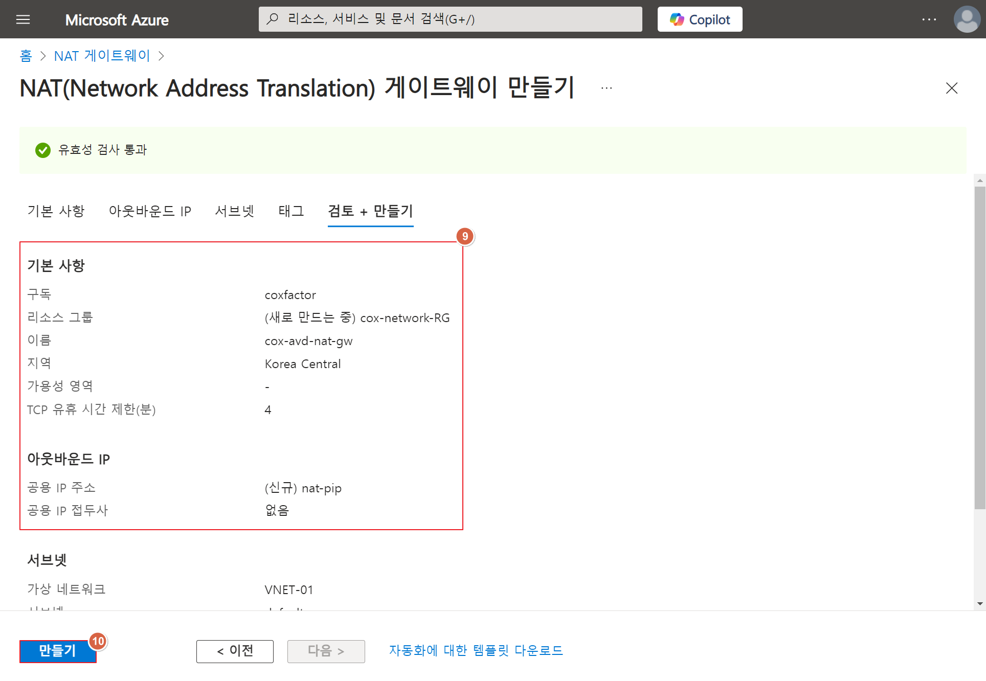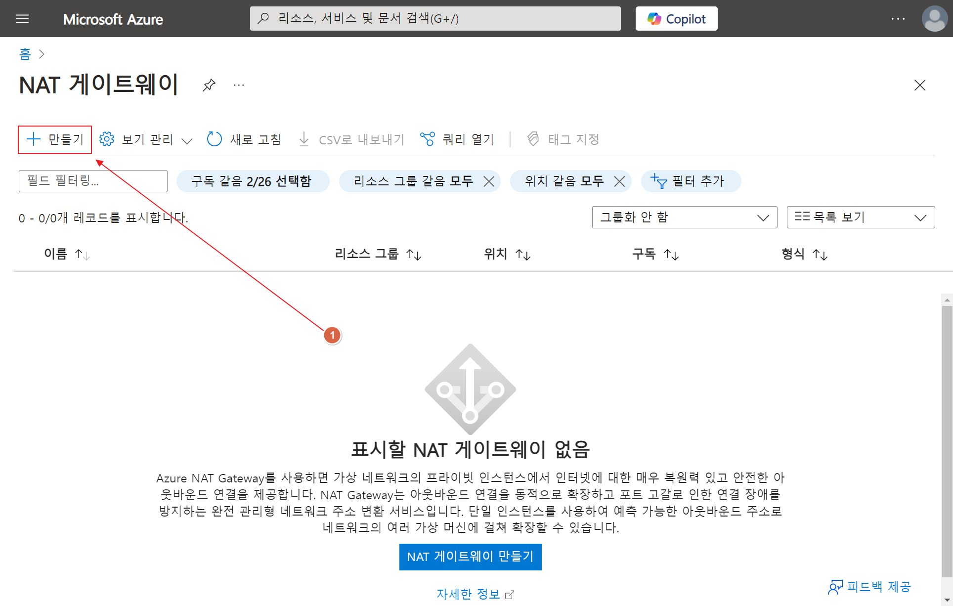 1. NAT Gateway 배포 Azure Portal ▶ NAT Gateway ▶ "+ 만들기"