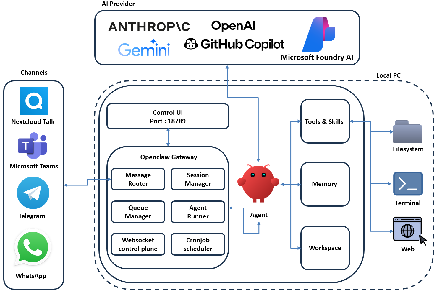 "OpenClaw" 는 Local PC에 설치되어 동작하는 AI Agent 운영 플랫폼이며, 여러 메신저 채널과 다양한AI Provider(Microsoft Foundry, Anthropic, OpenAI, Gemini등)를 연결해 기억·판단·실행하는 오픈 소스 AI Agent 입니다.- OpenClaw Install 바로가기 OpenClaw — Personal AI AssistantOpenClaw — The AI that actually does things. Your personal assistant on any platform.openclaw.ai 단순히 대화만 하는 챗봇이 아니라, 다음과 같은 일을 실제로 처리한다.파일 생성·정리 등 파일 관리웹 페이지 열기, 클릭, 검색 등 브라우저 제어이메..