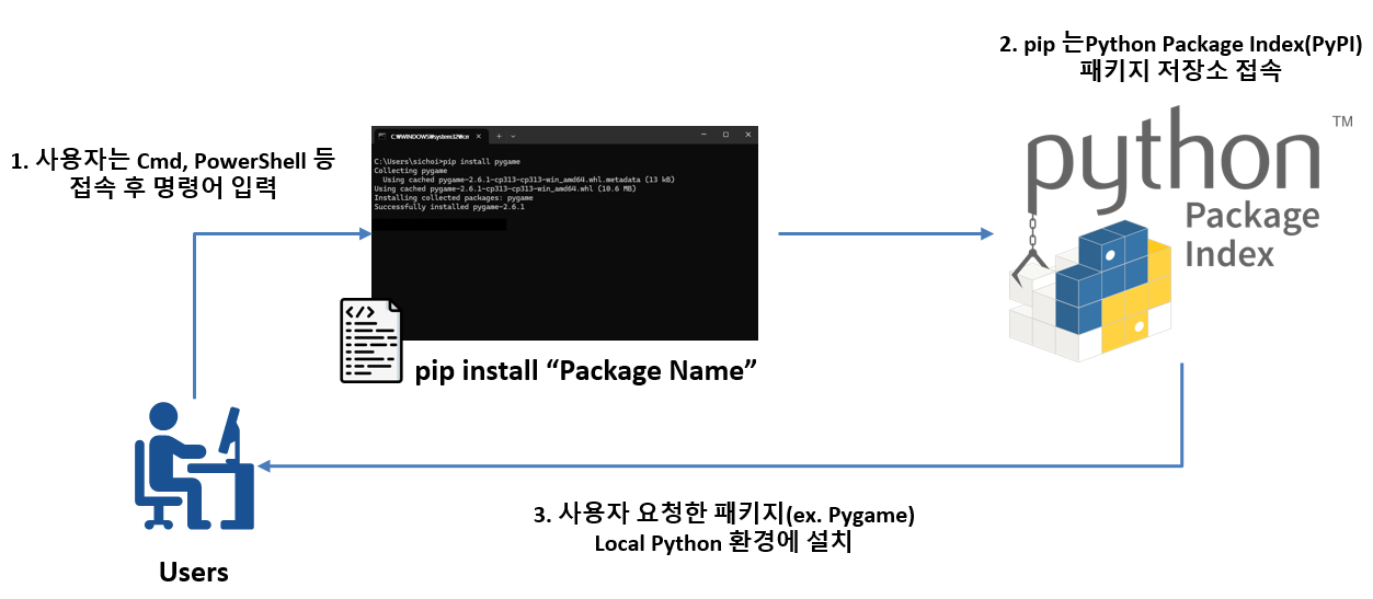 "Python PIP"는 Python에서 사용하는 패키지 관리 도구입니다. Python 개발자가 만든 다양한 라이브러리(패키지)를 설치하고 관리할 수 있도록 도와줍니다. PIP를 통해 Python의 기본 기능 외에도 다양한 외부 패키지를 활용하여 어플리케이션 개발에 필요한 기능을 쉽게 확장할 수 있습니다.- Python에서 pip으로 설치할 수 있는 대표 패키지 종류데이터 분석pandas테이블 형태의 데이터 분석 (엑셀처럼 사용)numpy수치 계산 및 다차원 배열 처리openpyxl / xlrd엑셀 파일 읽기/쓰기시각화matplotlib기본 그래프/차트 시각화 도구seaborn통계 기반 시각화 (matplotlib 확장)plotly인터랙티브 시각화 (웹 기반 그래프 등)머신러닝/딥러닝scikit-lear..